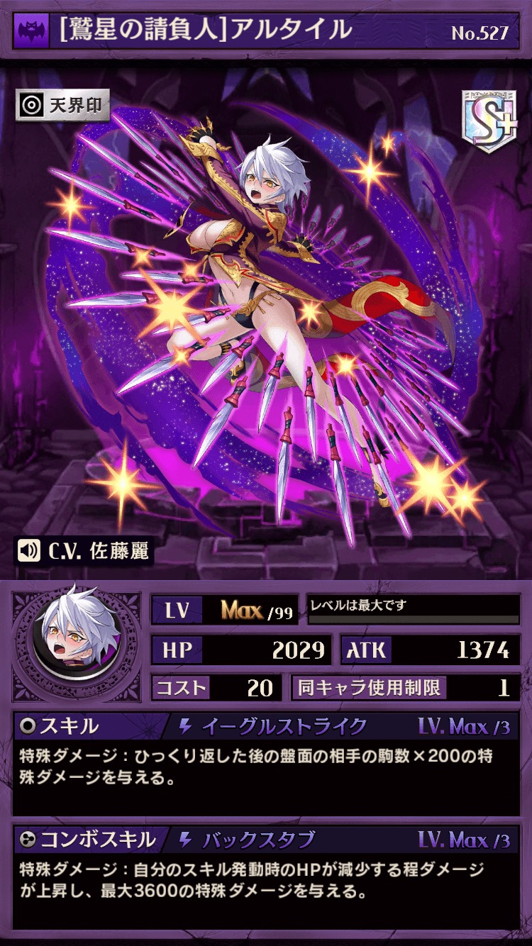今回の「荒鷲の翔輝(あらわしのしょうき)」で、プレミアムガチャに魔属性の激超レアSキャラ「アルタイル」が追加されます。この「アルタイル」は特殊ダメージを与えるスキルとコンボスキルをもっています。なお、「荒鷲の翔輝」開催期間中、「アルタイル」を含む魔属性のキャラクター(駒)の出現率がアップします。
