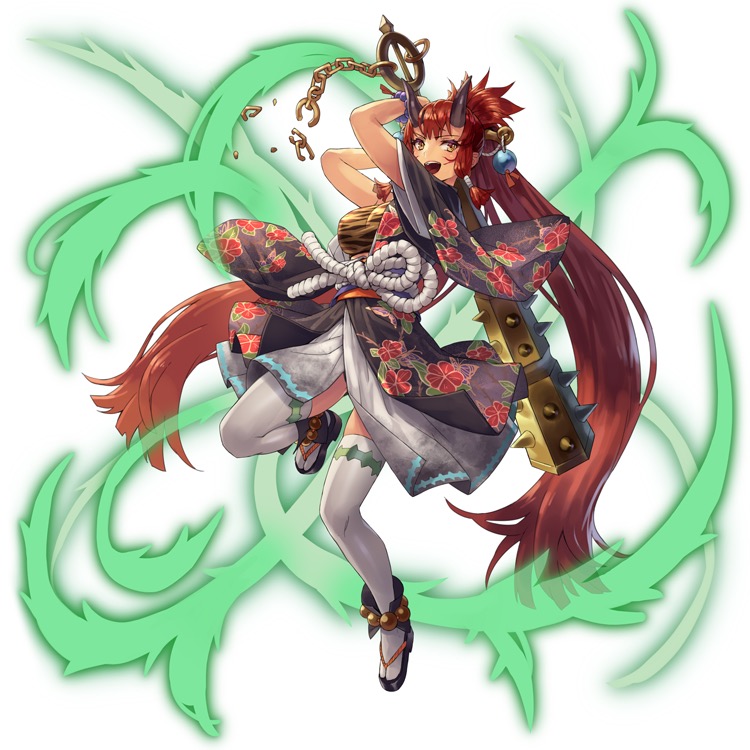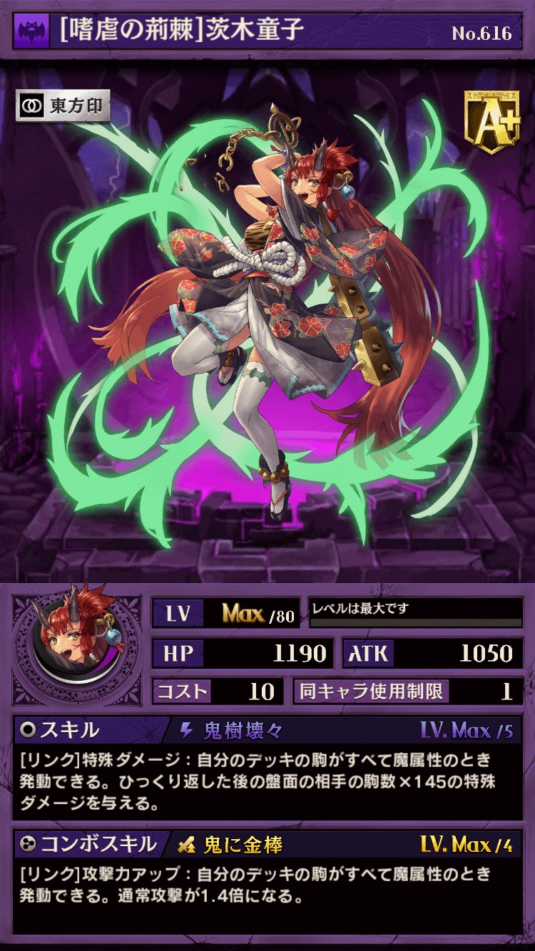 決戦イベント「決戦!茨木童子」は、時間限定で開催されます。本イベントは、ステージ専用キャラクター(駒)が登場するのが特徴です。イベントをクリアすると「茨木童子」を一定の確率で手に入れることができます。この「茨木童子」は、特殊ダメージを与えるスキルと、攻撃力を上げるコンボスキルをもっています。どちらも、自分のデッキが魔属性の駒のみで編成されているときのみ発動する[リンク]スキルのひとつです。