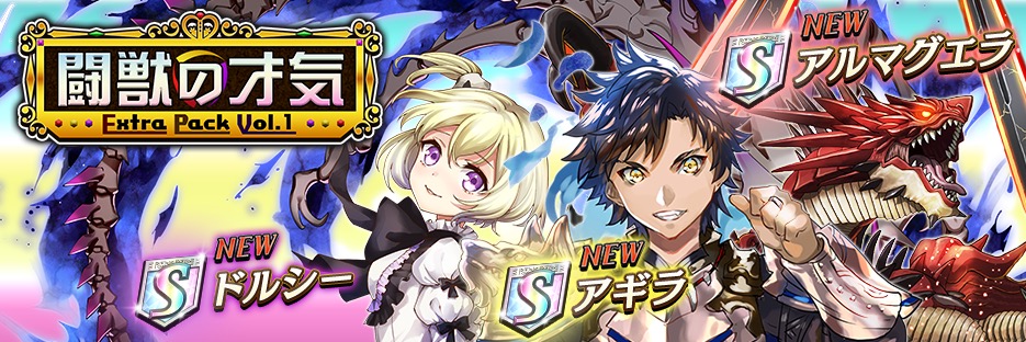 「エクストラパック vol.1-闘獣の才気-」に、激超レアSキャラ「アギラ」「ドルシー」「アルマグエラ」のほか、Aキャラクター(駒)3体、Bキャラクター(駒)3体が追加されます。なお、「エクストラパック vol.1-闘獣の才気-」の開催期間中は、各属性のキャラクター(駒)の出現率がアップする期間も設けられています。
