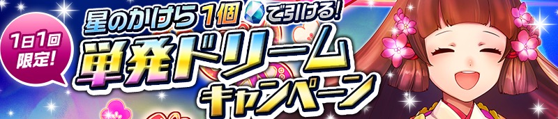 2017年1月17日(火)から、1日1回「星のかけら」1個でプレミアムガチャが引ける「毎日実施!単発ドリームキャンペーン」が開催されます。本キャンペーンは、期間中に開催するすべてのプレミアムガチャが対象です。