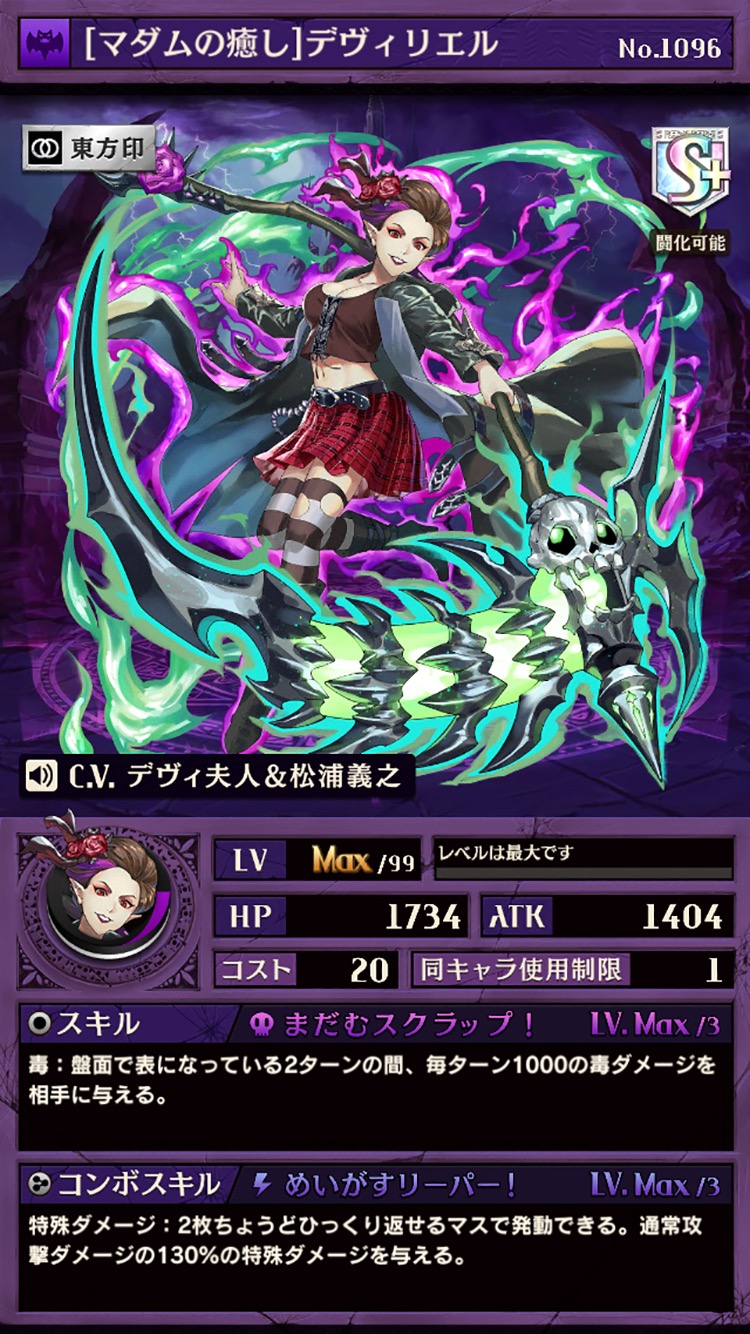 この「マダム・デヴィ」は、合成する闘化素材に応じて闘化後の属性が異なり、魔属性以外にすることもできます。また、デヴィ夫人のキャラクターボイスも「マダム・デヴィ」の魅力のひとつです。