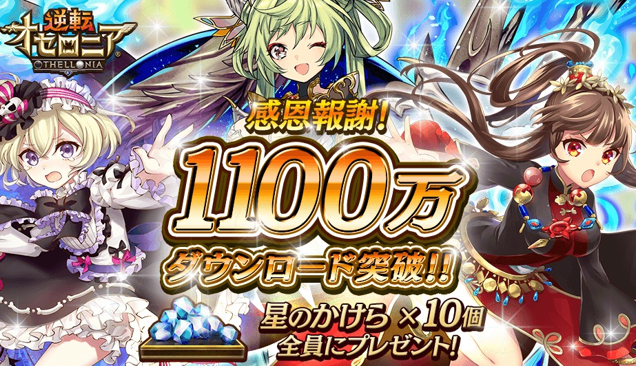 『逆転オセロニア』は、1,100万ダウンロードを記念して、2017年6月12日(月)に「星のかけら」10個がユーザー全員にプレゼントされます。