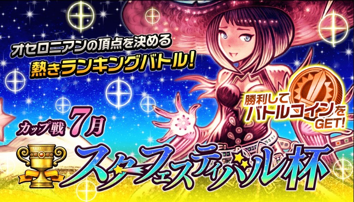 『逆転オセロニア』にて、7月カップ戦「スターフェスティバル杯」の開催日程が公開されました。使用デッキの制限ルールについては【前哨戦コロシアム】開始時に発表される予定です。