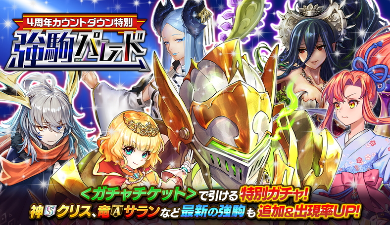 「4周年カウントダウン特別 強駒パレード」では、「ガチャチケットで引ける特別なガチャ」「爆・強駒パレード」「強駒ピックアップガチャ」が開催されます。