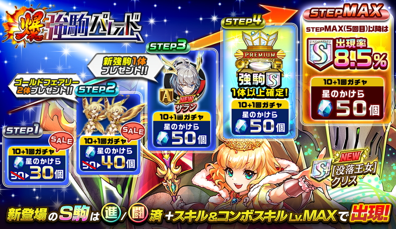 さらに、STEP4では激超レア強駒Sキャラを1体以上必ず入手でき、STEPMAX以降は激超レアSキャラの出現率がアップします。