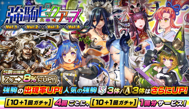 本ガチャは、Vol.1からVol.4まであり、それぞれで、神属性A「リフィエル」、魔属性A「アヴィリシア」、⻯属性A「マーレア」など特定の激超レアSキャラとAキャラクター(駒)の出現率がアップします。