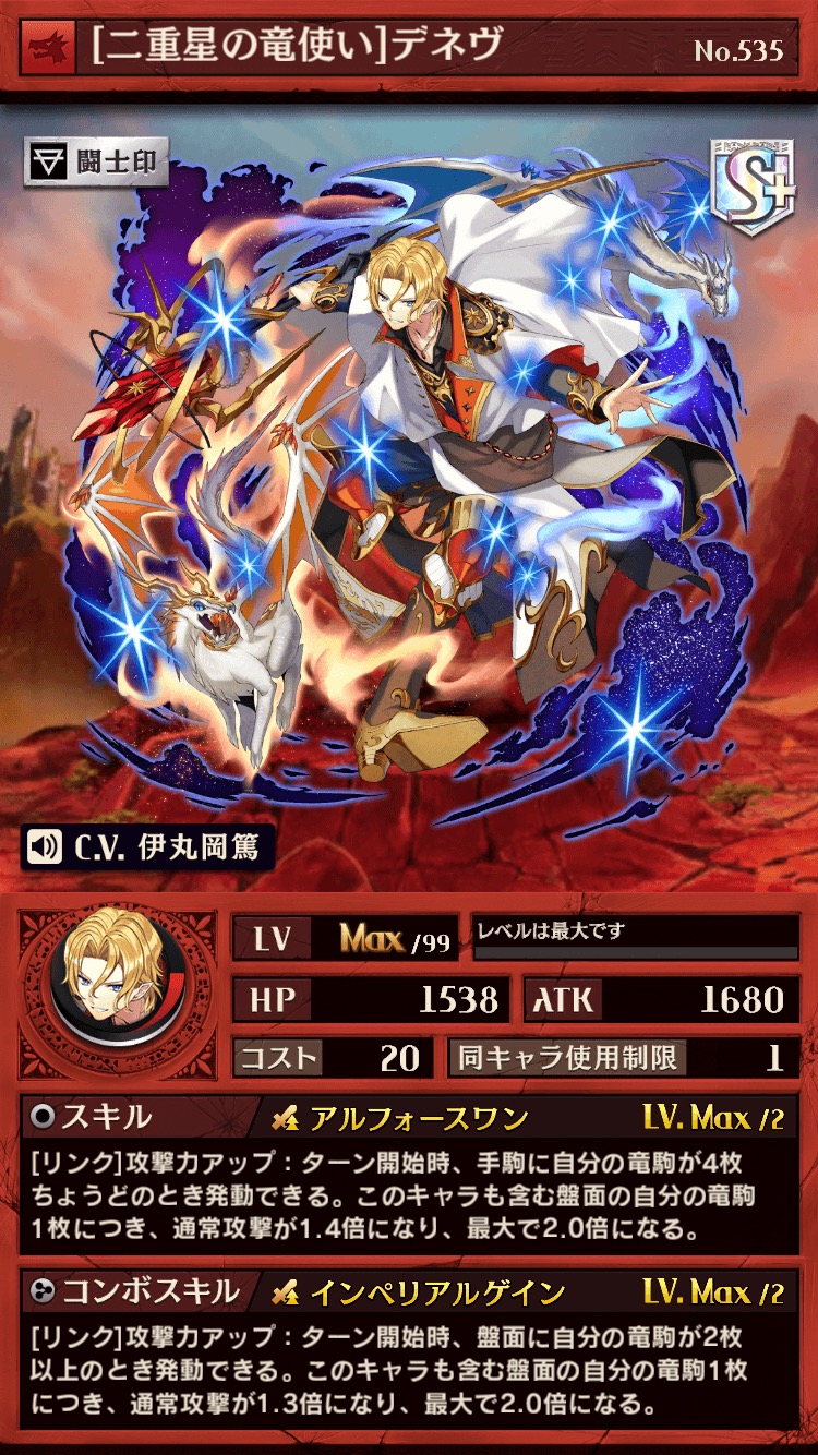 今回新たに登場したデネヴは竜属性のSキャラ。ステータスの基本ATKがユルルングルよりも僅かながら高く(※ユルルングルが1678。デネヴが1680。)、スキルのバフ倍率が同等ということもあり、一撃の爆発力はユルルングルを超えます。