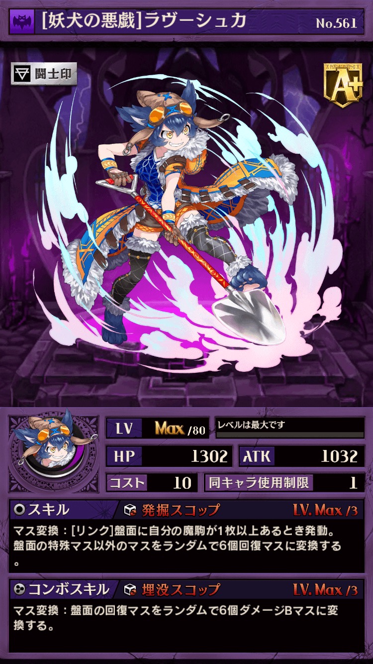 スキル「発掘スコップ」は、盤面のマスをランダムで回復マスに変換する[リンク]能力で、コンボスキル「埋没スコップ」は回復マスをダメージBマスに変換する能力。その為、最初のスキル発動時に回復マスがどこに出現したかで、コンボスキルを発動するかしないか選べるのがポイントです。