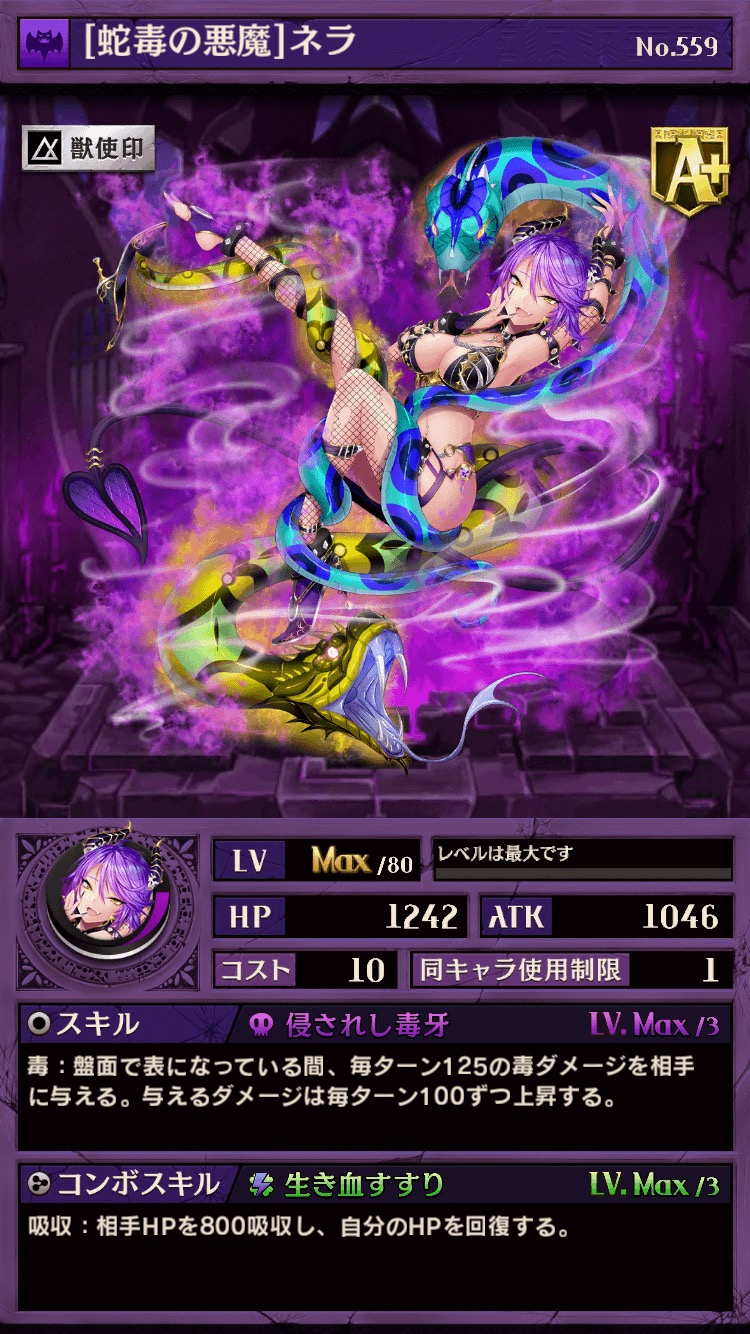 Aキャラのネラは、スキル「侵されし毒牙」の毎ターン100ずつ上昇する毒スキルが特徴。序盤に打つことができれば、終盤になっていくほど強力になっていきます。毒デッキに入れるのがおすすめです。