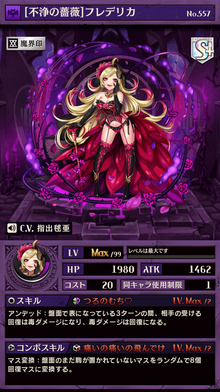 Sキャラのフレデリカは、何と言ってもスキル「つるのむち♡」が特徴的。盤面で表になっている2〜3ターンの間、相手の受ける回復は毒ダメージへとなり、毒ダメージは回復となります。まさに、終盤で大きく回復をする神デッキにとっては天敵のような能力。ケット・シー、イシス、天照大神などのキャラクターをデッキに入れているプレイヤーは要注意ですね!