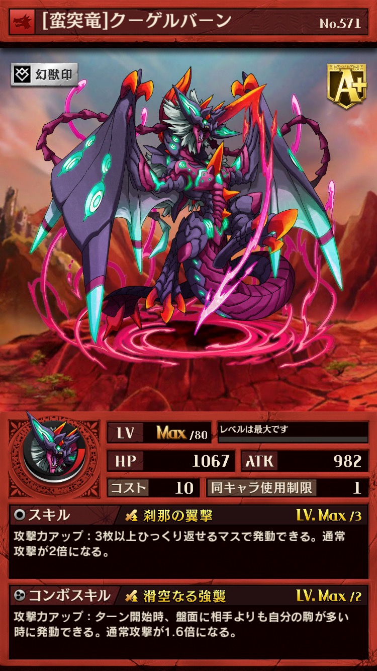 Aキャラのクーゲルバーンは、スキルに“3枚以上ひっくり返せるマスで発動し、通常攻撃が2倍になるバフ能力「刹那の翼撃」を所持しています。若干使いづらさはあるものの、基本ATKも1000を下回るので、使いどころがなかったら相手のカウンター対策として使用するのも有りです!