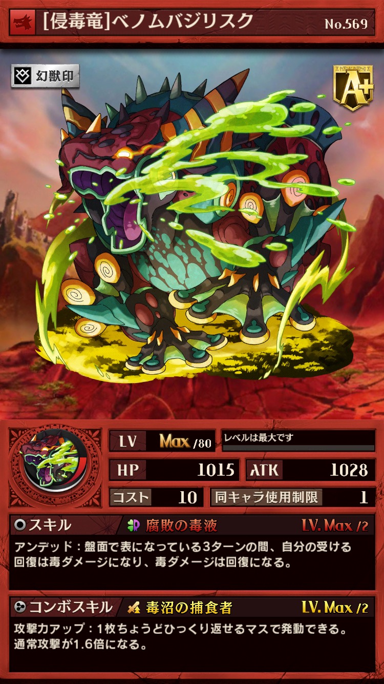 スキル「腐敗の毒液」は、“盤面で表になっている2〜3ターンの間、自分の受ける回復は毒ダメージになり、毒ダメージは回復になる”という能力です。超駒の魔属性キャラであるアズリエル対策になるので、ぜひ入手しときたいキャラクターです。