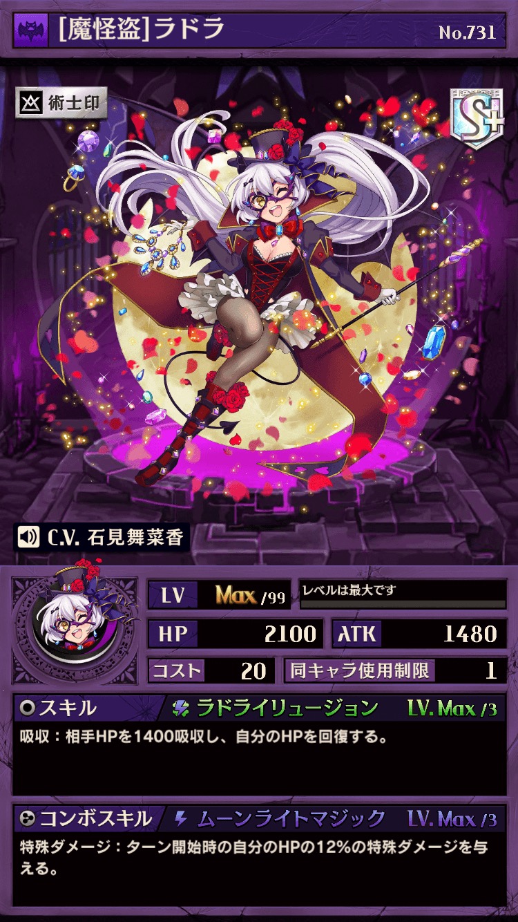 ラドラは、スキルには吸収能力がある「ラドライリュージョン」を所持。スキルLv.Maxで相手のHPを1400吸収し、自分のHPを回復することができる。フルカスのコンボスキル「禍々しき笑み」のスキルLv.Max時よりも高い数値となっており、発動も無条件なのが魅力だ。