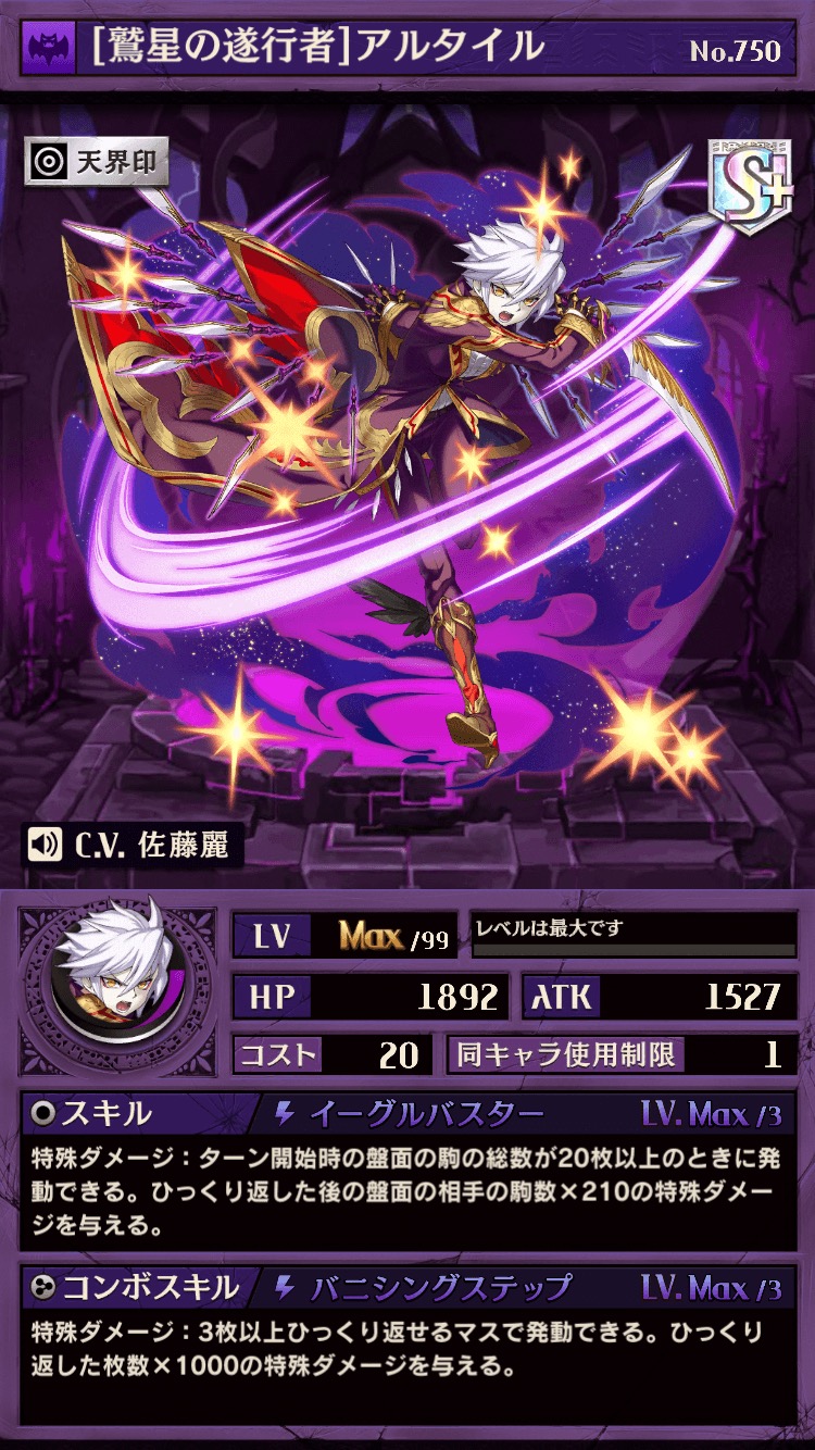 スキル「ヘルスチェック」は、スキルLv.Maxで、“盤面で表になっている間、毎ターン600回復できる能力”となっており、ルエドの回復バージョンのような能力。コンボスキル「ヒュギエイアの杯」は、HPが少なくなった終盤での回復が大きいので、長期戦となりやすい神デッキに組み込みたいキャラクターだ。