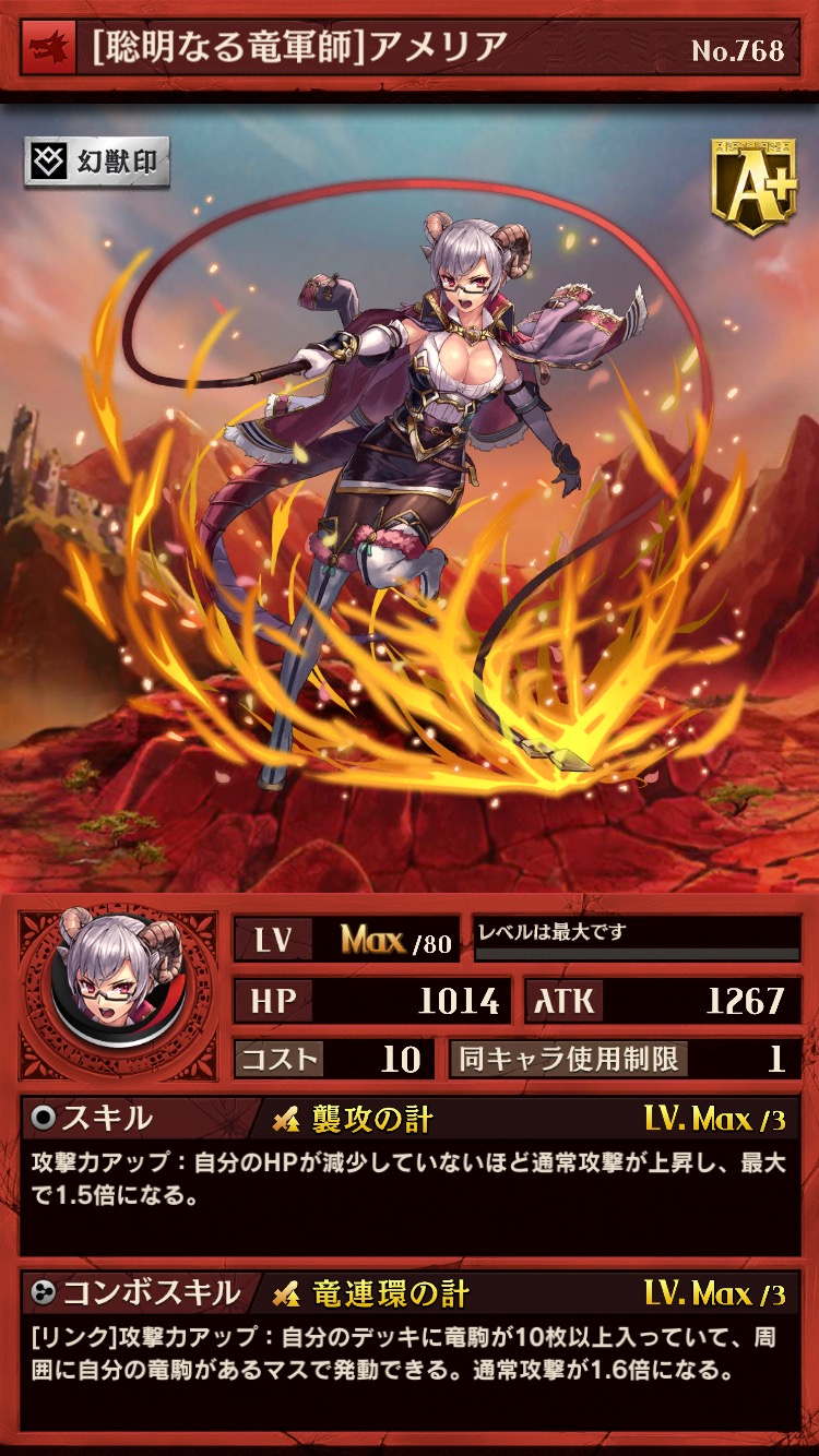 アメリアは、スキル、コンボスキルともに竜属性らしいバフ能力を持つA駒。コンボスキル「竜連環の計」は[リンク]なので、主に竜デッキの中に組み込みたいキャラクター。しかし、少し発動条件が厳しいため、タイミングと戦況を考えながら使っていきたい。