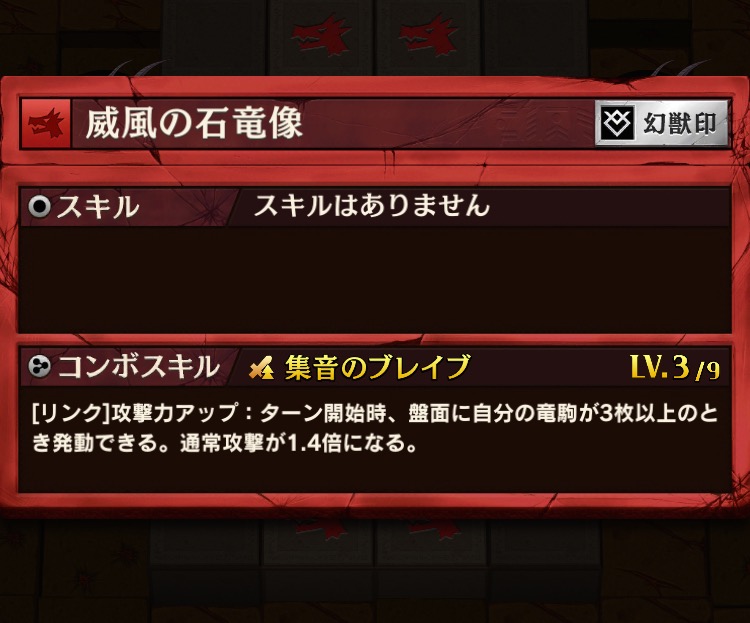 [リンク]攻撃力アップ:自分のデッキに竜駒が10以上入っていて、周囲に自分の竜駒があるマスで発動できる。通常攻撃が1.4倍になる。