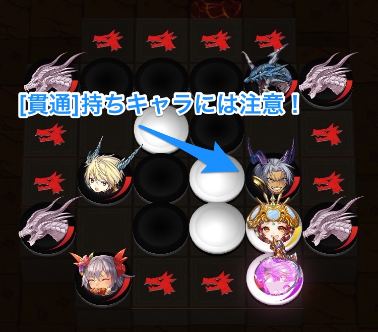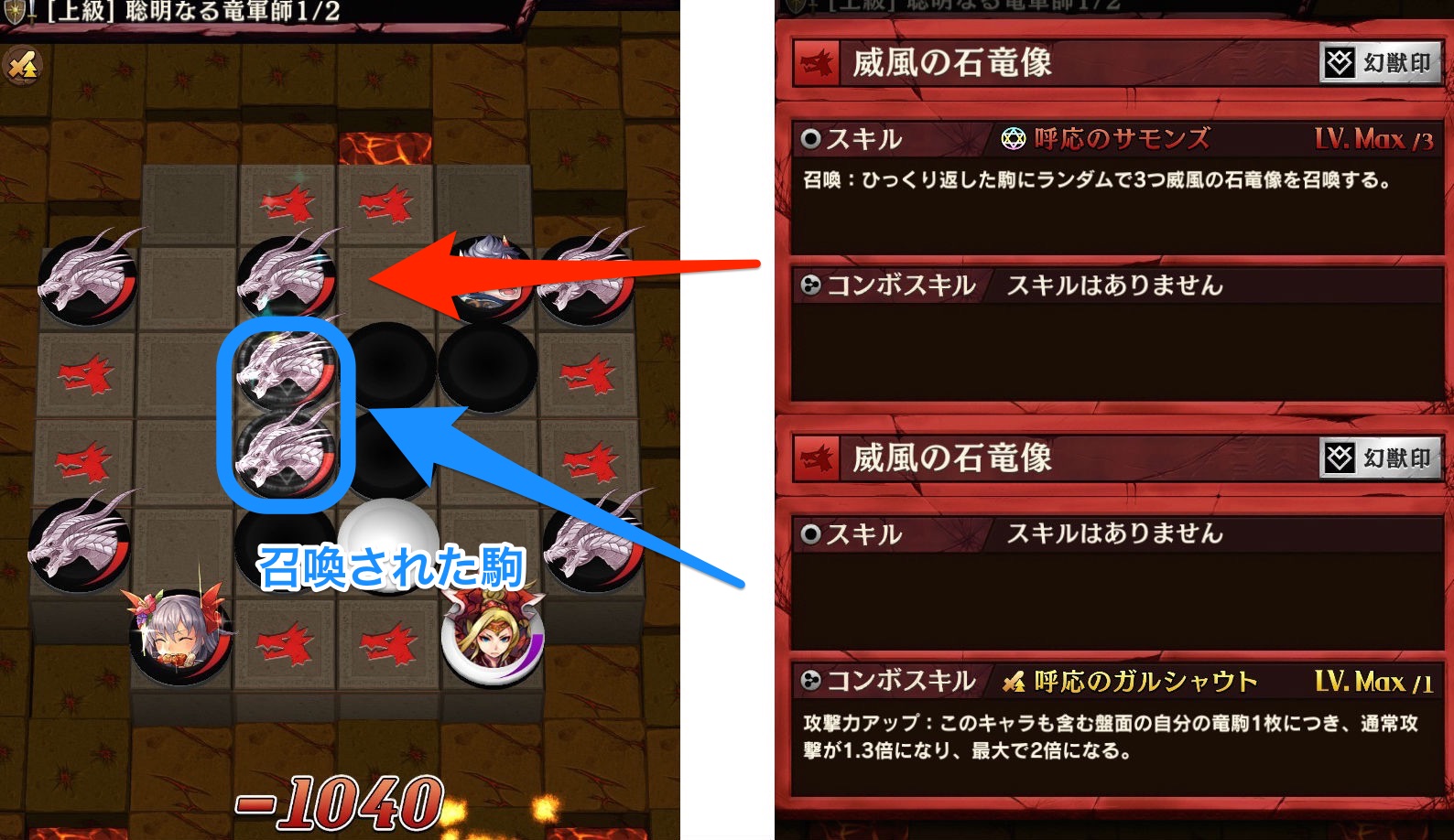 特に厄介なのはバトル中版に出てくるステージ専用駒の[召喚]スキルになっており、召喚されたバフ効果が2倍のコンボスキルと竜属性のパワーアップマスが合わさってしまうと非常に危険。なるべく早めにひっくり返すか、コンボルートを繋げさせないようなプレイングを心掛けよう!