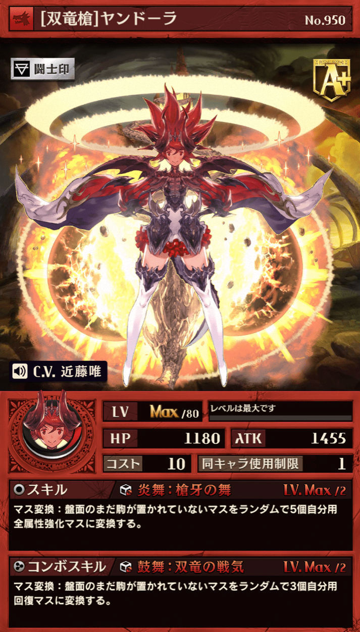 今回のカップ戦報酬であるヤンドーラはスキル、コンボスキルともにマス変換を所持。スキルでは自分用全属性強化マスに、コンボスキルでは自分用回復マスに変換してくれます。プレイヤー自身にデメリットはなく、なおかつ属性依存もないので、どんなデッキにも組み込むことができるキャラクターです。
