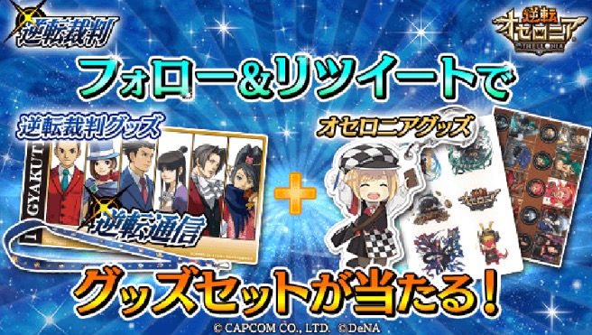 現在『逆転オセロニア』公式Twitterにて、「逆転裁判」とのプレゼントキャンペーンが開催中です。対象ツイートをリツイート&アカウントをフォローすた方の中から、抽選で計25名に逆転裁判グッズとオセロニアグッズのセットがプレゼントされます。