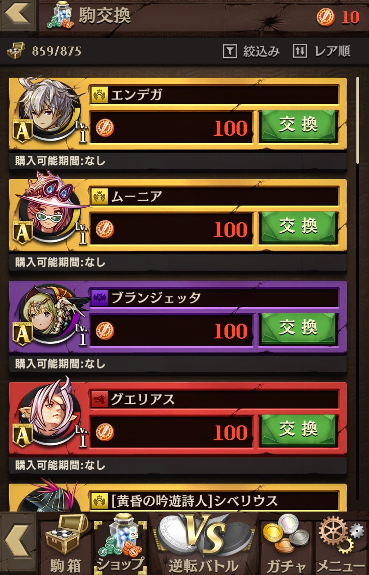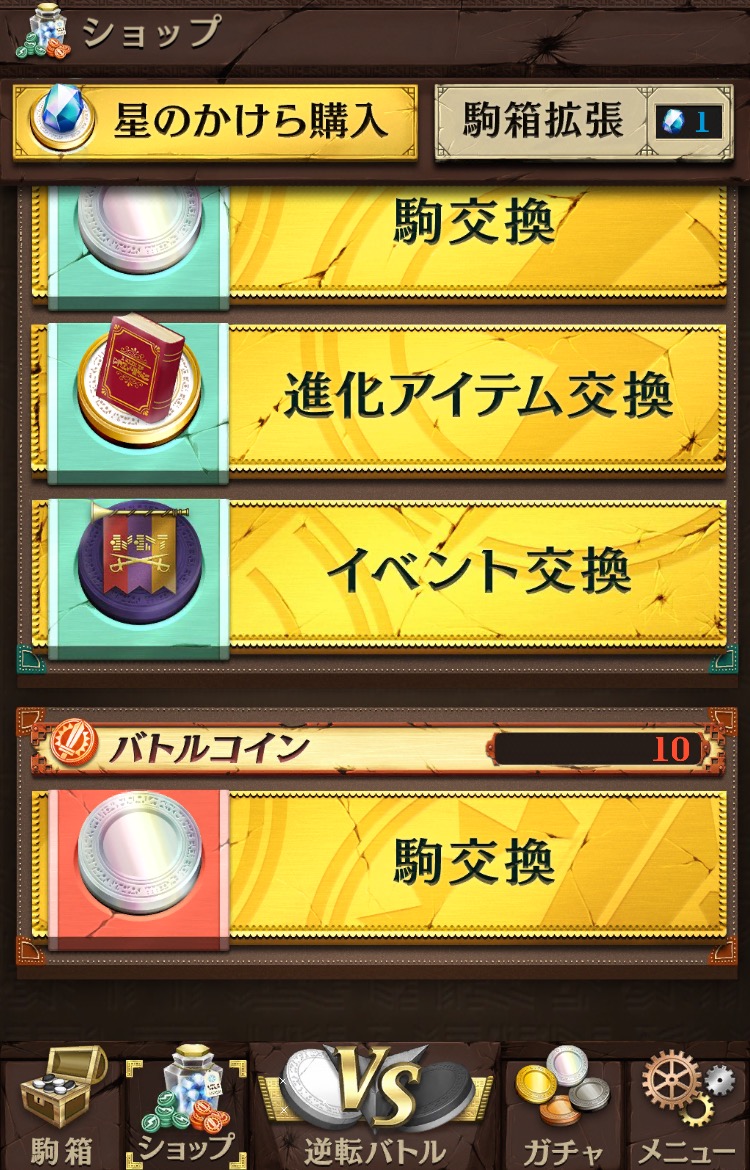 特定のキャラクター(駒)と交換することができます。交換可能なキャラクター(駒)は、カップ戦報酬駒、クラスマッチ報酬駒、「各属性のタートル」の3種類となっています。