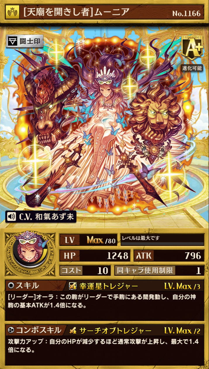 弱点はかなり限定的で、本体のコンボスキルも盤面にあると非常に強力なバフ。ダメージソースとして非常に優秀なキャラクターと言えるでしょう。