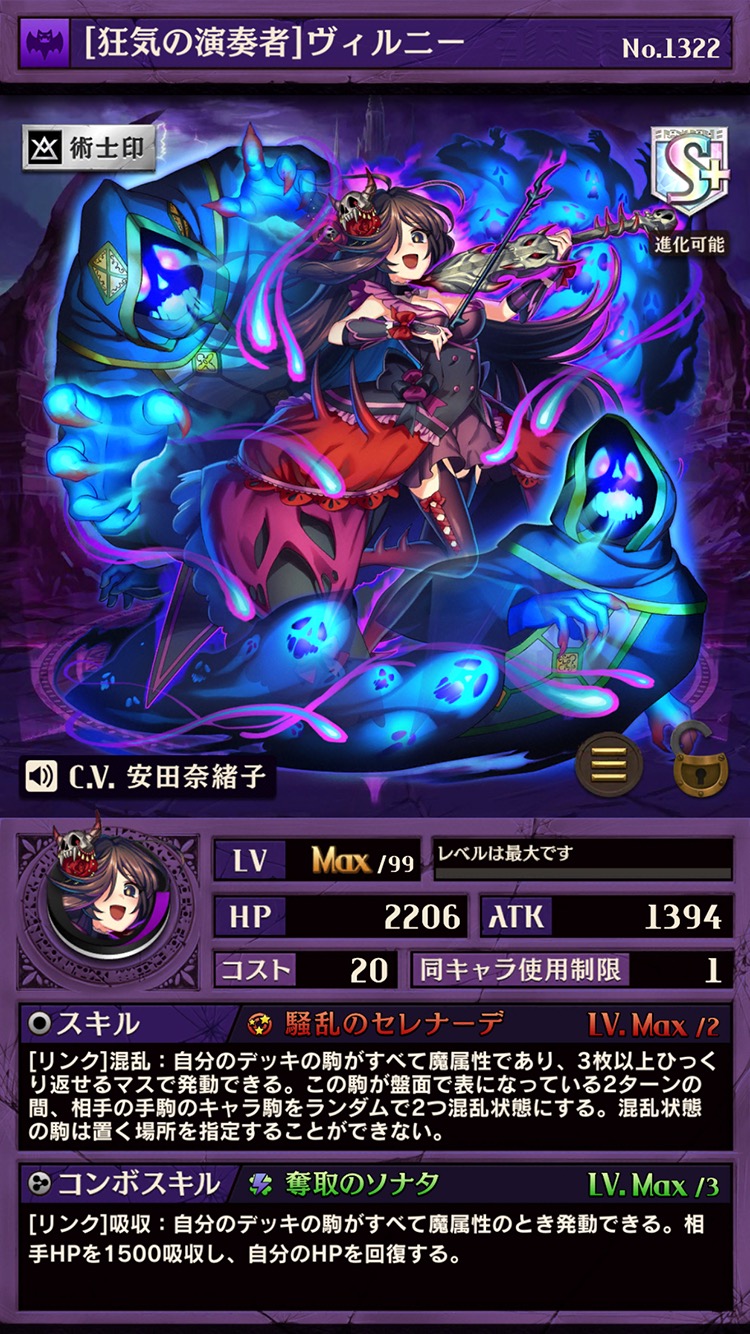 [狂気の演奏者]ヴィルニー(S+)(CV:安田奈緒子)属性:魔※進化(闘化)後スキルレベル最大時のものです。▼関連記事「強駒パレード」限定Sキャラの性能評価まとめ
