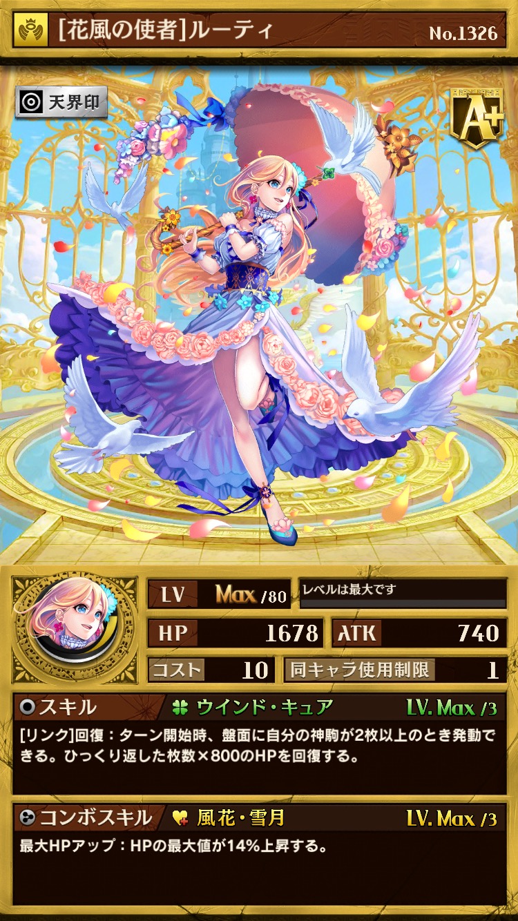 [花風の使者]ルーティ(A+)属性:神※進化後スキルレベル最大時のものです。トゥーミエは、一見すると