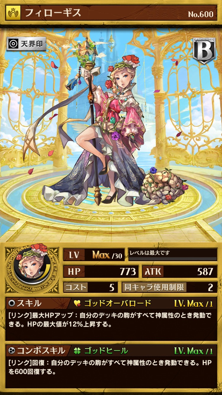 能力はスキル、コンボスキルともに回復耐久デッキ向けとなっています。手駒にある間発動するスキルを持ち、なおかつ終盤はコンボスキルも使えるという汎用性の高さが魅力です。麒麟などの回復量UPを持つ他の駒と合わせれば、さらなる回復に期待できます。