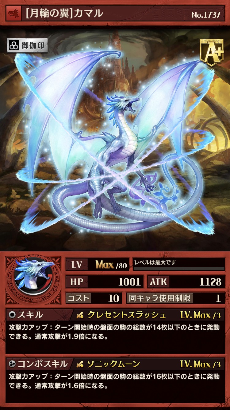 スキル・コンボスキルともに竜属性らしいバフになっており、どちらも味方を活かすような能力となっているのが特徴。B駒としては非常に高い性能を持つものの、コンボスキルのみが相手のリーダー依存なので、対人戦での安定感に欠けます。特定のイベントなどでは非常に重宝しそうです。