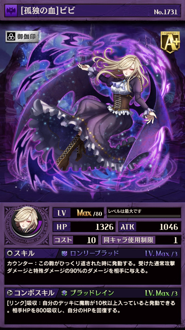 魔染めデッキでは、非常に使い勝手の良いキャラクター。スキルは魔染めデッキのみで発動できる吸収となっており、HPが不足しがちな魔デッキでは貴重な回復ソースになります。