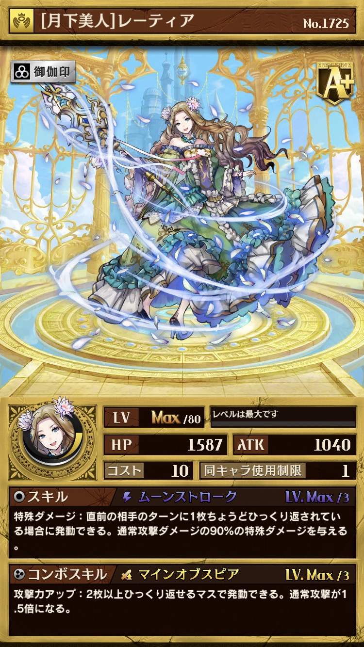 通常攻撃ダメージと特殊ダメージの両方を返せるカウンター駒。あえてひっくり返されやすいマスに打つことで、相手への牽制となります。コンボスキルは使いやすい吸収なので、ひっくり返されなくても回復ソースとして使っていきたいところです。