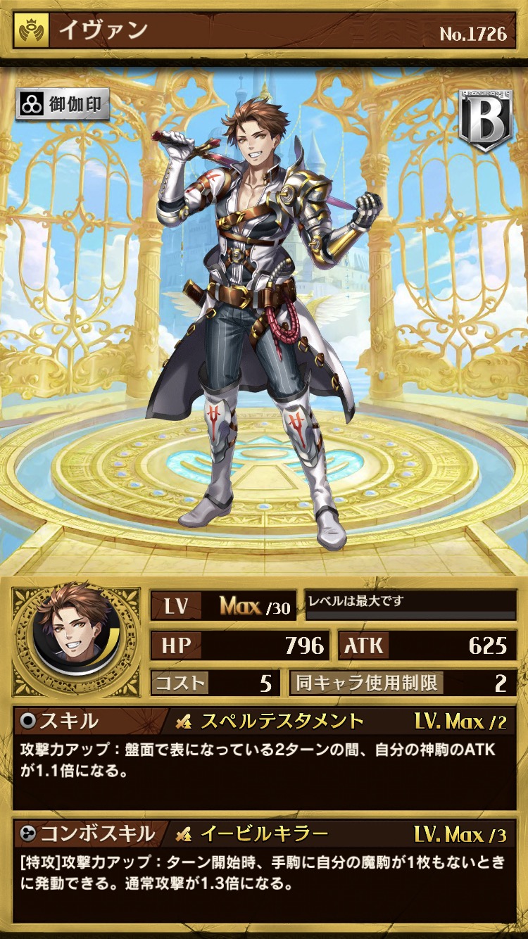 スキル・コンボスキルともにバフを所持。味方のATKを上げる能力となっており、攻撃的な神染めデッキでは、B駒枠として候補となりそうです。