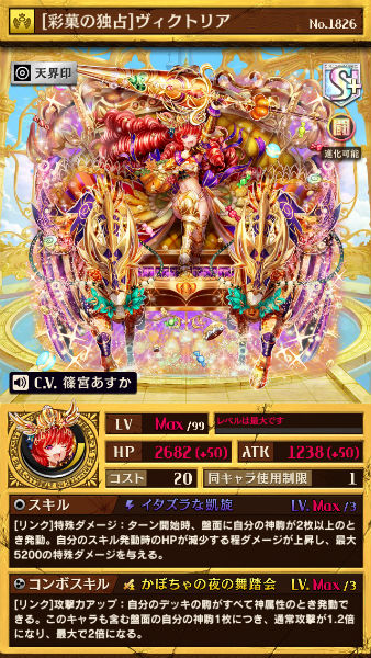 スキルは通常のヴィクトリアのコンボスキルに似ていて、神属性単体のデッキで効果を発揮します。スキルはHPが減少する程ダメージが上昇して最大で5200もの特殊ダメージを与えることができるので、アタッカーやフィニッシャーとして優秀な働きをするでしょう。
