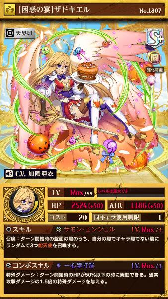 盤面の自分のキャラ駒以外の駒に最大3体「能天使」を召喚する能力を持つのが特徴。「能天使」はひっくり返された時に、特殊ダメージを半減することができるので、神属性などの特殊ダメージで攻撃をしてくる駒の多いデッキに対して非常に役に立ちます。