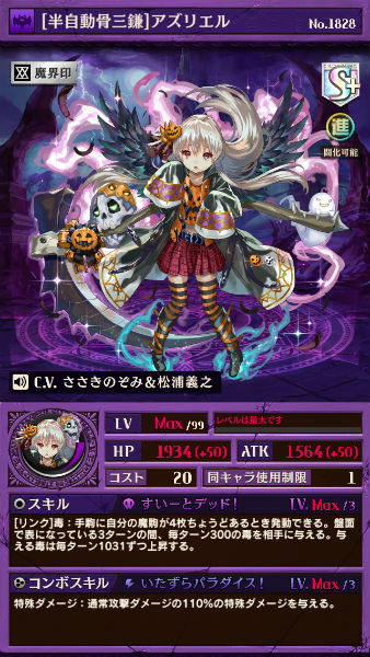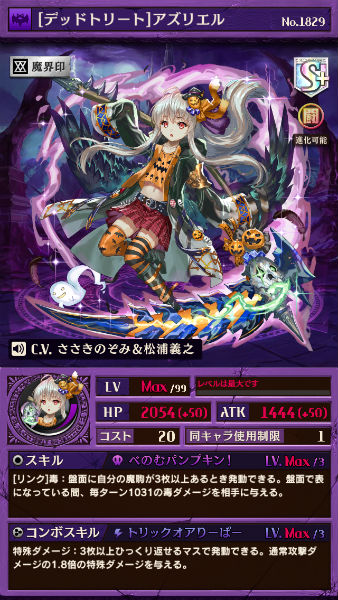 今回登場した新キャラの中でも、おすすめは断然「ハロウィン・アズリエル」です。進化と闘化のどちらとも魔デッキでの運用となりますが、非常に強力な毒スキルが魅力的です。