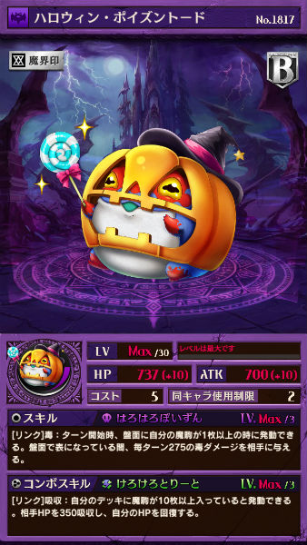 盤面に表で存在する限り、永続的に毒ダメージを与えるスキルは汎用性が高く、コンボスキルも吸収と使いやすいので、魔デッキの汎用駒として役に立ちます。