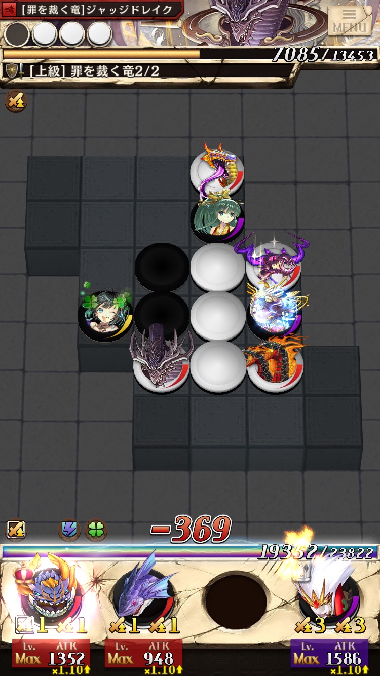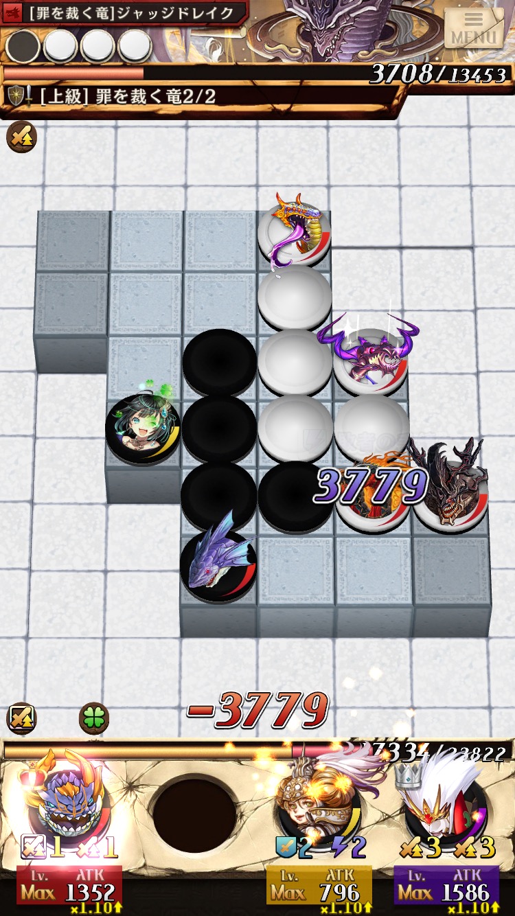 上級の2ステージ目の後攻初手で角に置かれるので、スキル「其処ニ居ル恐怖」が発動してしまう。相手の竜属性のパワーが底上げされるので、それを踏まえたうえでのダメージ計算をしておこう。