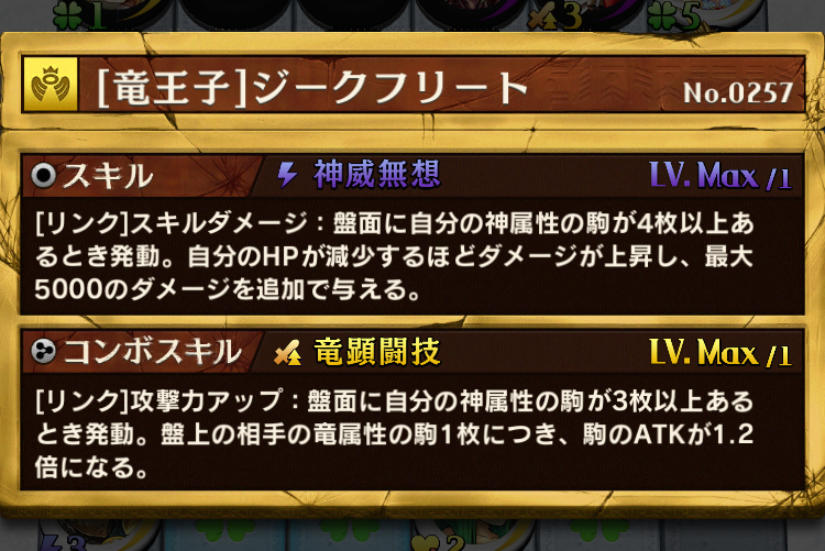 [リンク]攻撃力アップ:盤面に自分の神属性の駒が3枚以上あるとき発動。盤上の相手の竜属性の駒1枚につき、駒のATKが1.2倍になる。