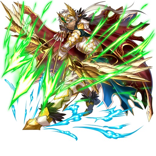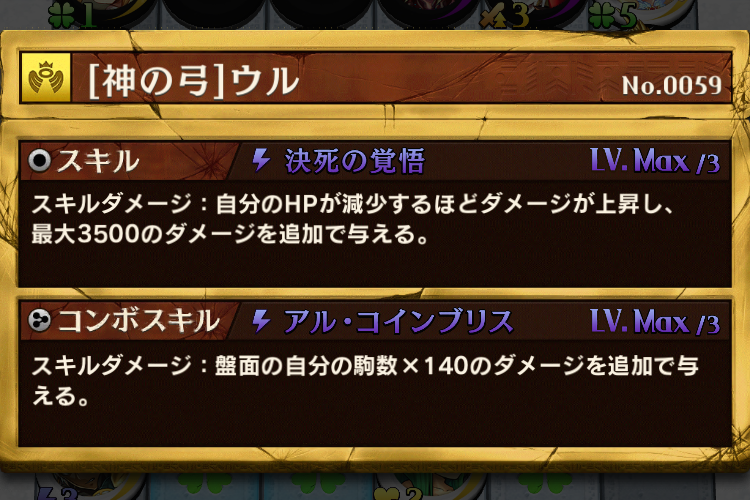 [リンク]スキルダメージ:盤面に自分の神属性の駒が4枚以上あるとき発動。自分のHPが減少するほどダメージが上昇し、最大5000のダメージを追加で与える。