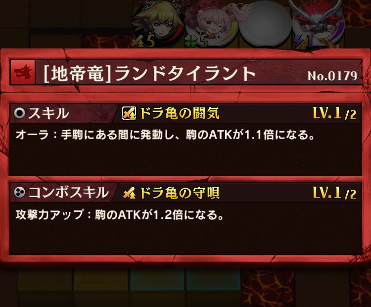 攻撃力アップ:周囲に自分の竜属性の駒があるマスで発動できる。駒のATKが1.4倍になる。