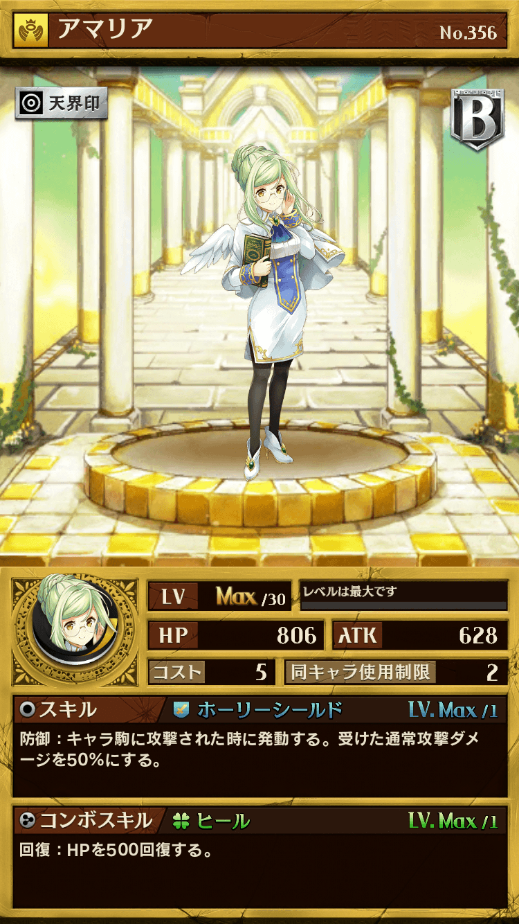 アマリアも上記のエンジェルナイトと同様のスキル「ホーリーシールド」を持ち、相手を牽制するのに役立つ。大きく違う点はコンボスキルの能力で、上記のエンジェルナイトのコンボスキルは「コインカース」と攻撃的だったのに対し、アマリアのコンボスキルは「ヒール」と回復系の能力になっている。