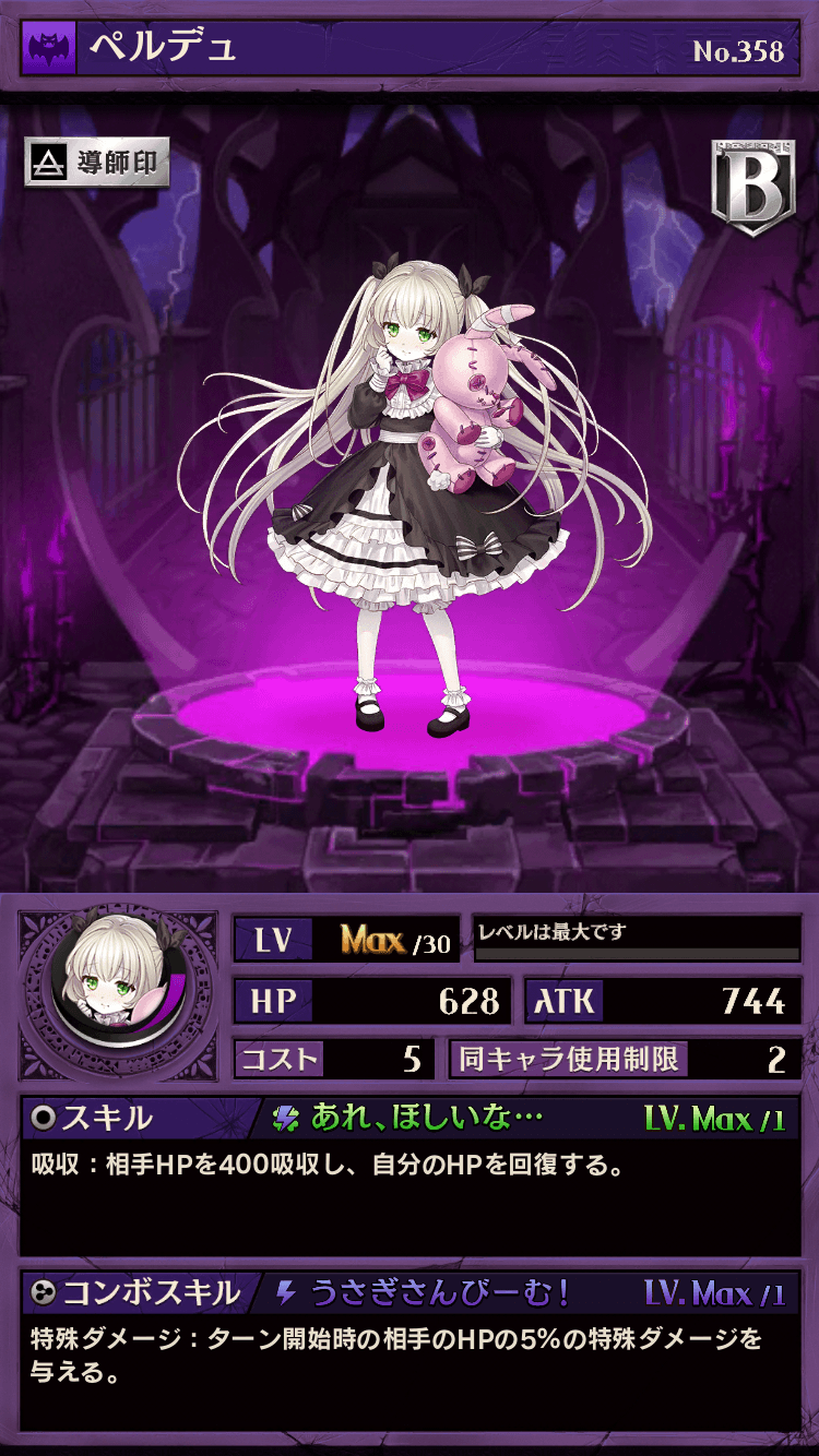 スキル「あれ、ほしいな…」は、相手のHPを吸収して、その分自分のHPを回復する能力。現時点(※2016/05/26)で、スキルに吸収の能力のある唯一のキャラで、非常に魔属性らしい能力と言える。