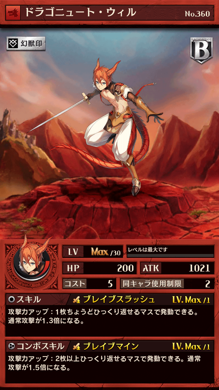 最後に紹介するのは竜属性のウィル。スキル、コンボスキル共に重宝しそうな能力を持つ。最大HPが200とかなり少ないが、最大ATKはBキャラなのにも関わらず1000を超える。