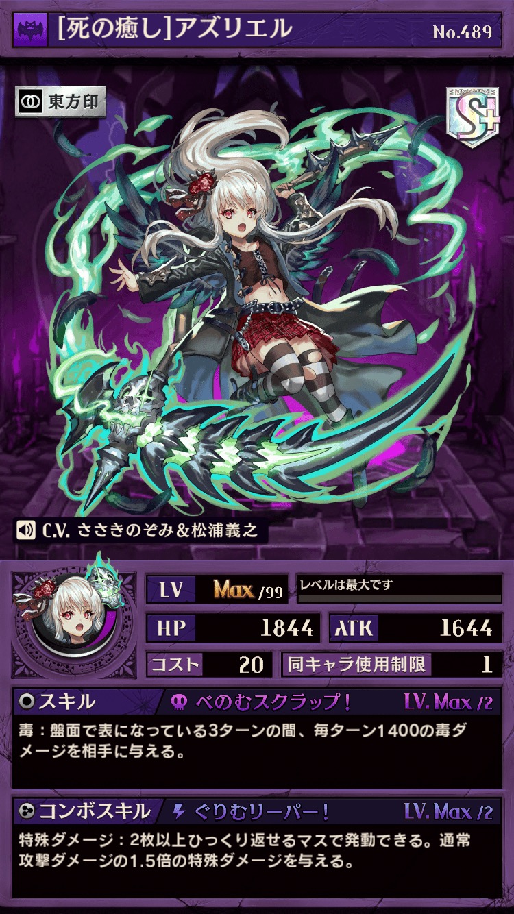 特にアズリエルのスキル「べのむスクラップ!」は、3ターンという制限はあるものの毒で1300〜1400のダメージはかなりインパクトがあり、超駒に登場するキャラクターの中でも屈指の強さを誇っています。コンボスキル「ぐりむリーパー」も使い勝手がよく、毒デッキ以外でもかなりの効果が期待できますよ!