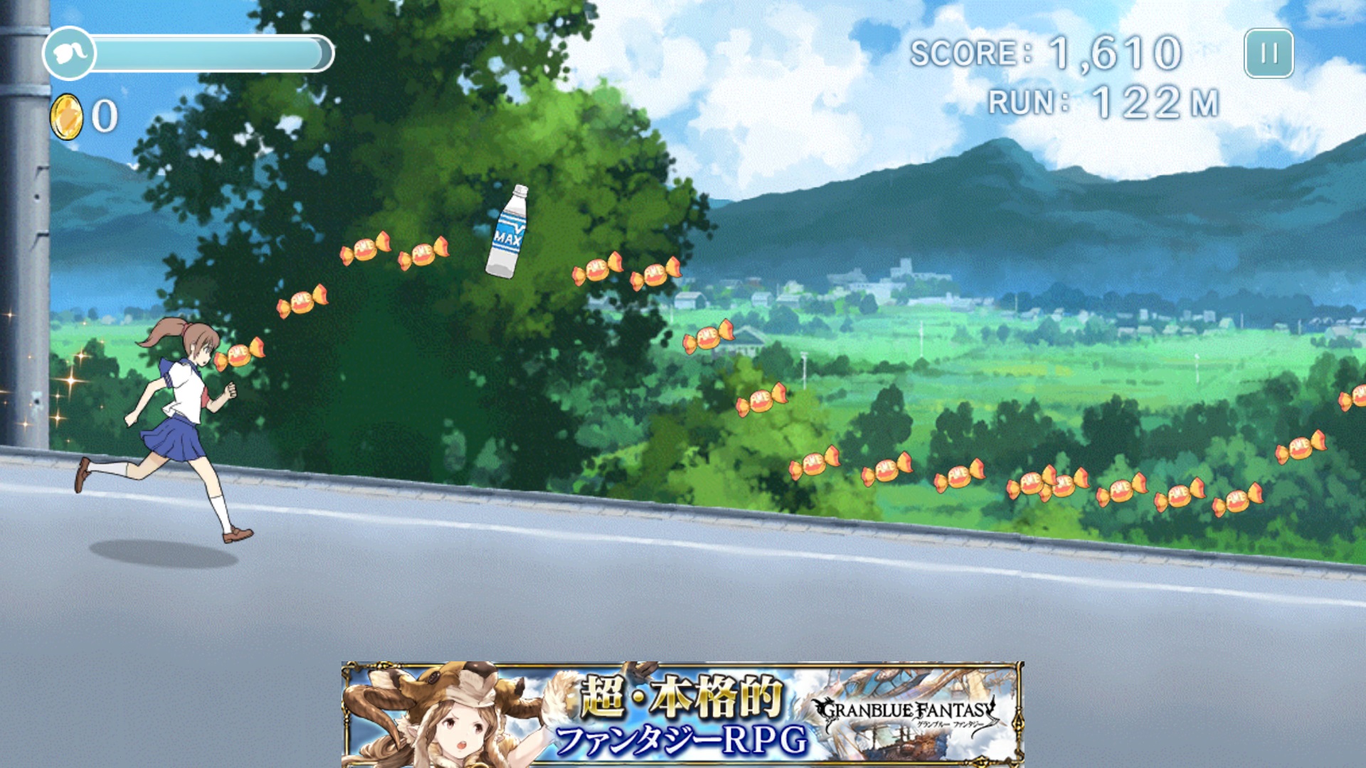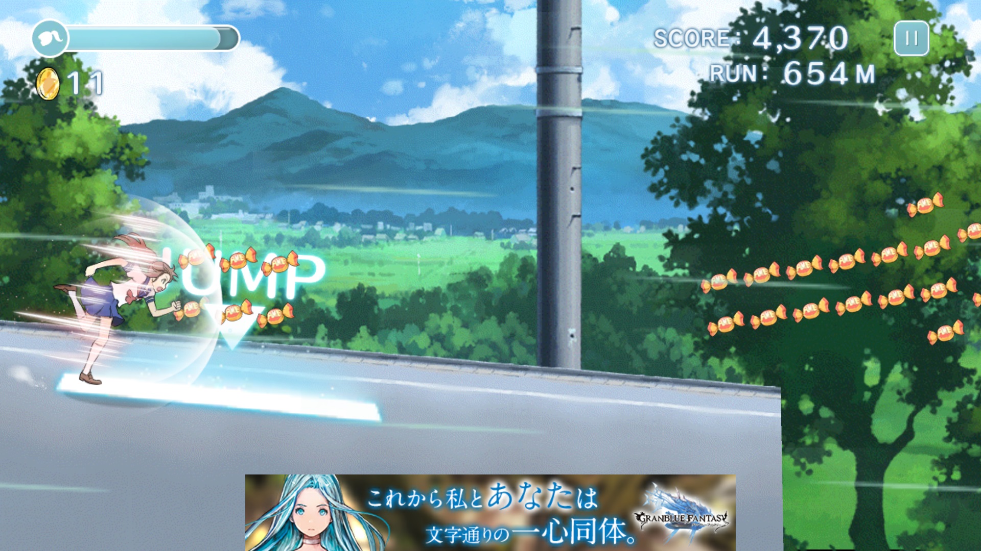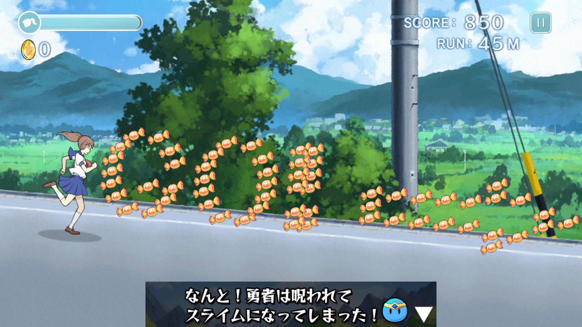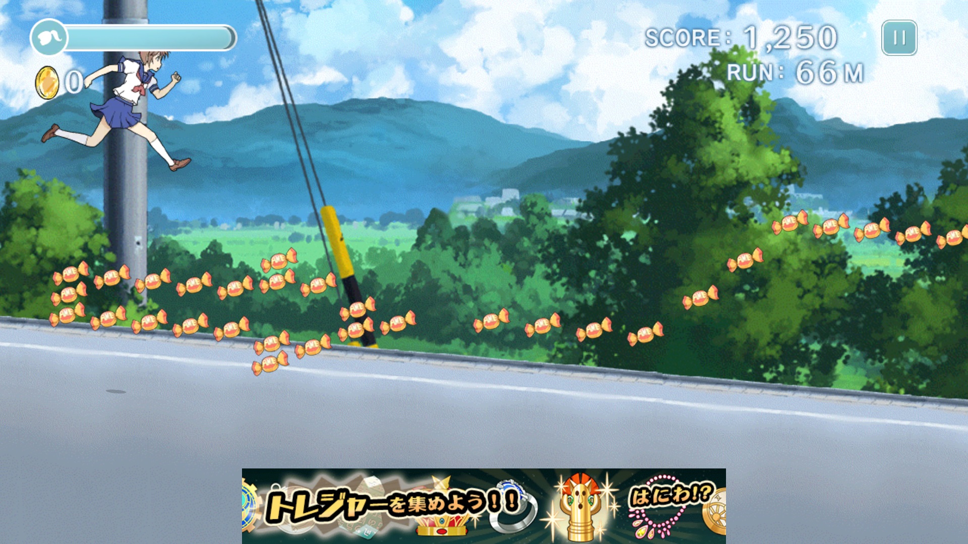 坂道を走る動作は自動で、画面をタップすると乙女がジャンプします。またジャンプ中にもう1度タップすることで、空中でもさらにジャンプが可能!