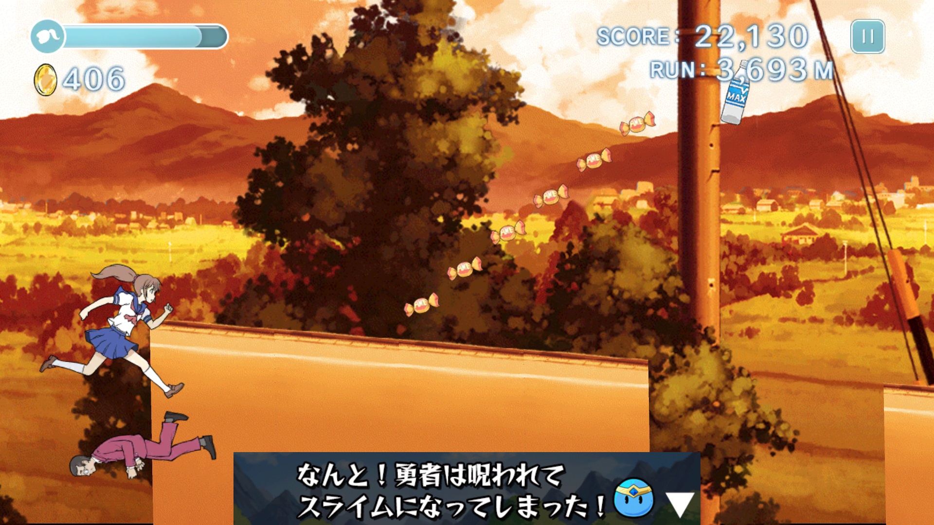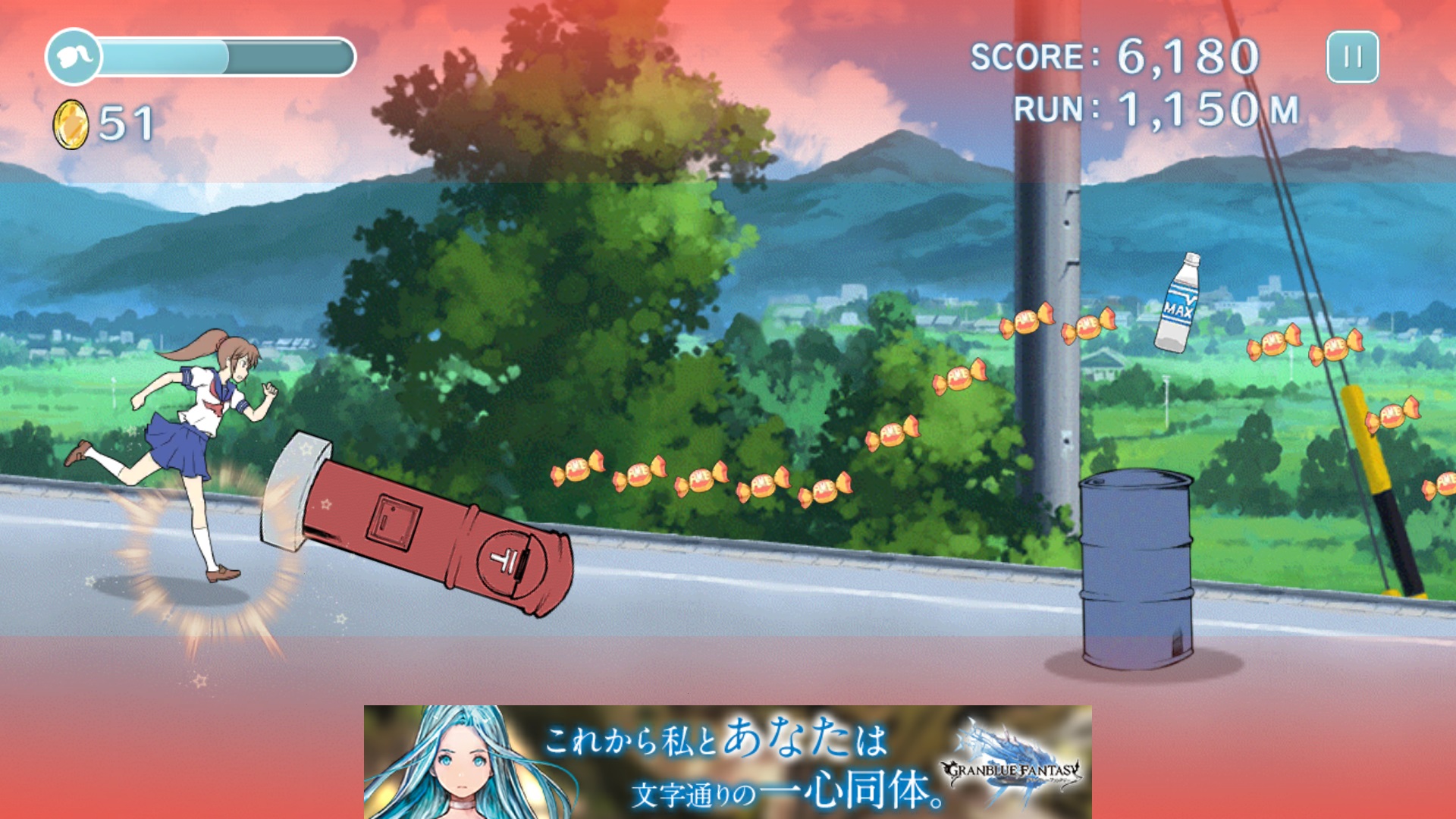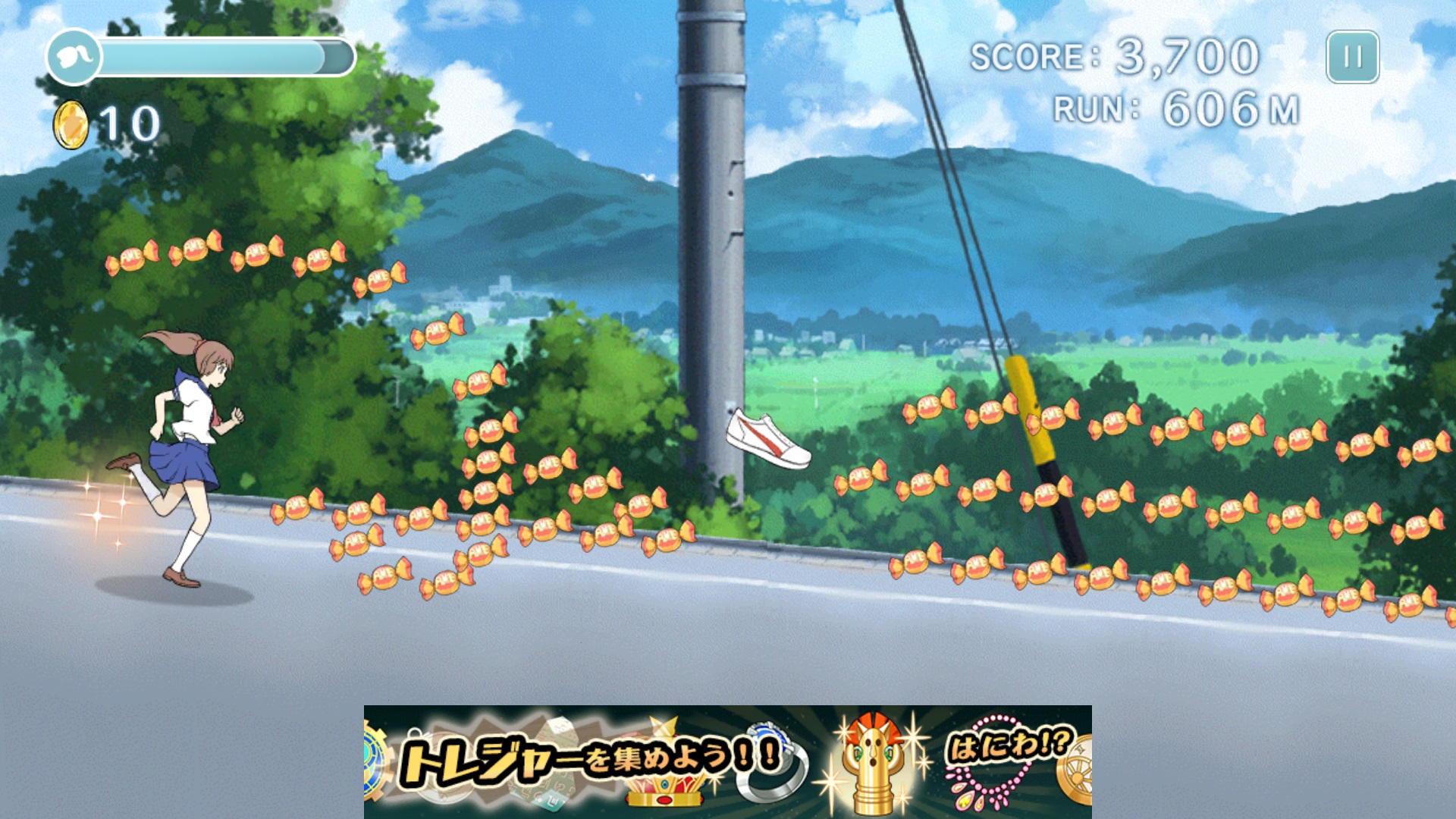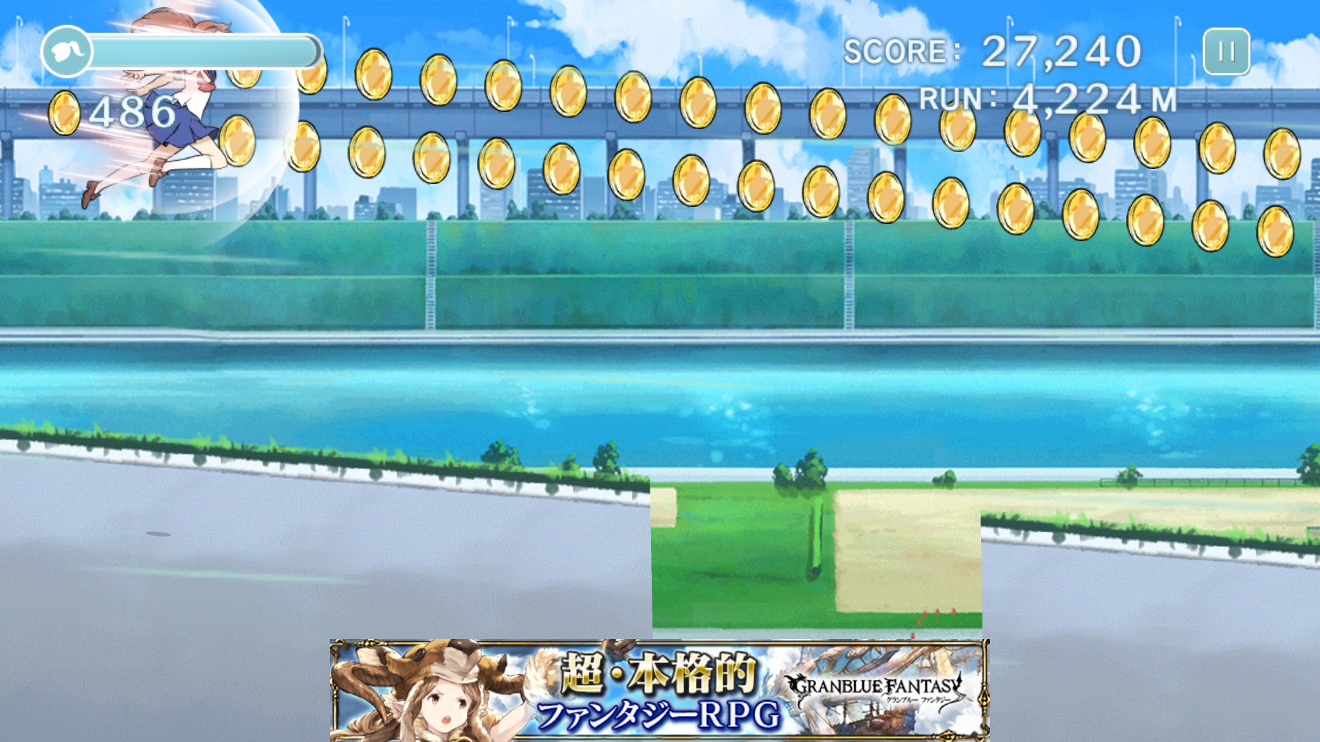 坂道を走る動作は自動で、画面をタップすると乙女がジャンプします。またジャンプ中にもう1度タップすることで、空中でもさらにジャンプが可能!