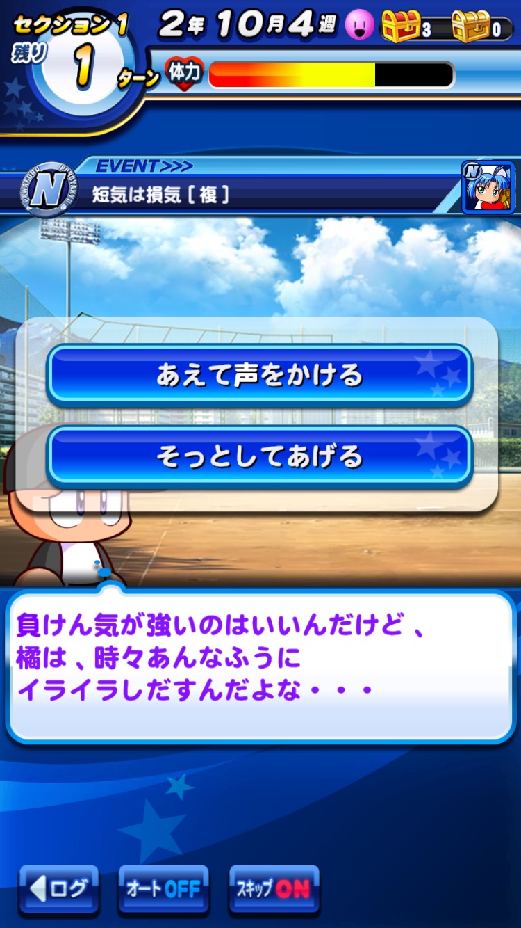 ターンを進める際、ほぼ確実にイベントが発生!これによって経験点が獲得できたり、体力の増減があったり、やる気が変動したりします。中には選択肢が発生するものも...!?