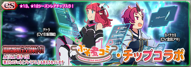 本コラボでは、esスクラッチ「ぷそ煮コミ・チップコラボ」が開催され、「ぷそ煮コミ」でおなじみの「テトラ(CV:引坂理絵)」「§イチカ§(CV:金田アキ)」が★12チップで登場しています。