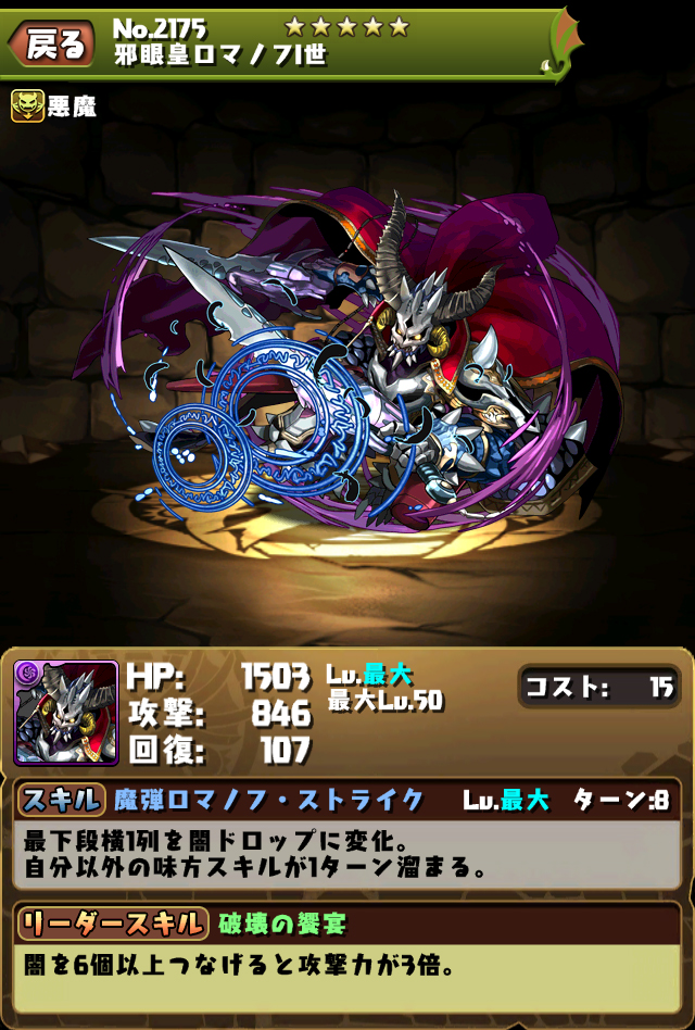 調整前:悪魔タイプのHPが1.5倍。闇を6個以上つなげると攻撃力が3倍。