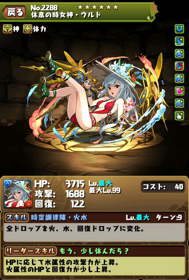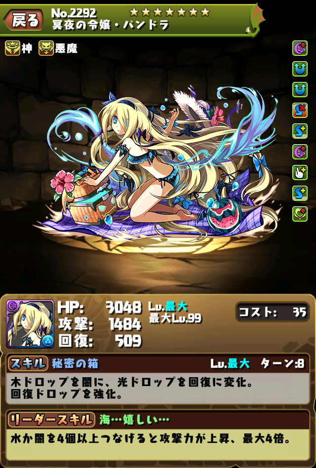 リーダースキル | どうだ、一緒に泳がないか? 神と回復タイプのHPが少し上昇、攻撃力は3.5倍。スキル使用時、攻撃力が1.5倍。 |